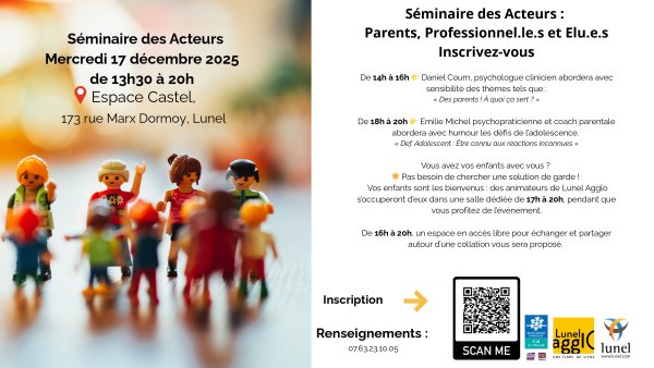 Dans le cadre des actions du territoire en faveur de la parentalité, Nous vous invitons à noter la date du mercredi 17 décembre 2025 de 13h30 à 20h pour la 2ᵉ édition du Séminaire des Acteurs dans le cadre de la Convention Territoriale Globale signée entre la Caf de l’Hérault , Lunel Agglo et la ville de Lunel. Cet événement a pour ambition de proposer un temps d’échanges dynamique et accessible à tous – familles et professionnels du territoire – autour des enjeux liés à la parentalité, avec un zoom sur l'adolescence.
